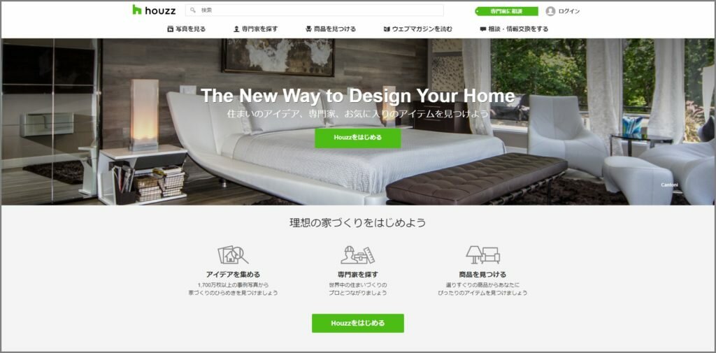 Houzzでは、実際の家や部屋の閲覧、専門家への相談、商品の検索と購入ができるサイトです。好きなイメージを見つけて欲しい家具やインテリアを調べ、専門家に相談して、実際に商品を買うところまで一貫してできます。マイホームを建てる前段階の設計から活用できます。